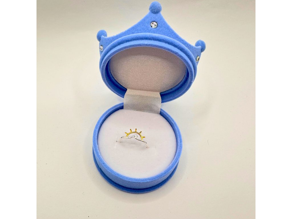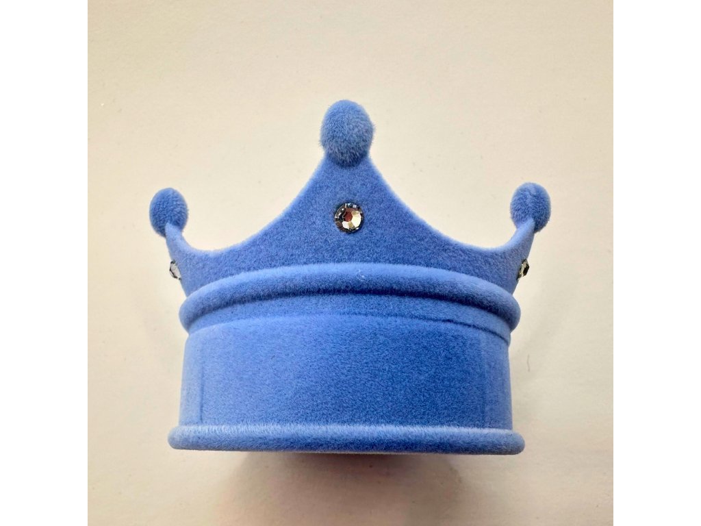 Zamatová darčeková krabička je v tvare koruny s malými lesklými kamienkami na jej vrchole. Jej povrch je jemne modrý a vnútro čisto biele. Vhodná na prstene, náušnice a prívesky.