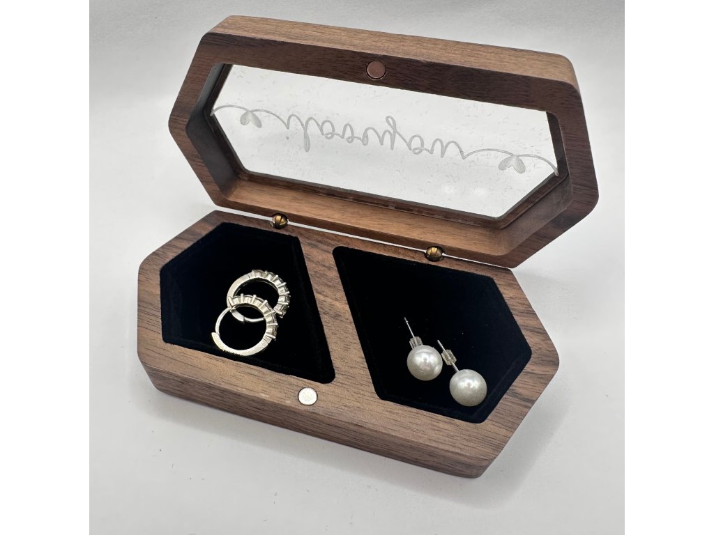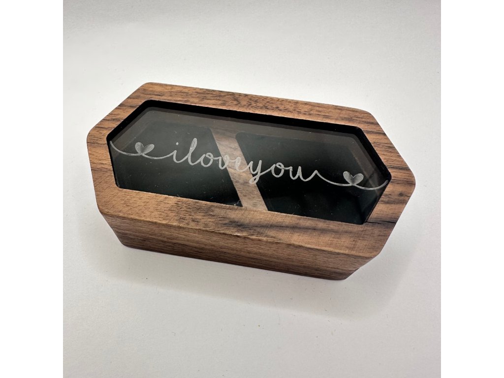 Prémiová drevená darčeková krabička na šperky s nápisom I love you a dvoma srdiečkami. Jej vnútro tvoria dve priehradky, kde si môžete uchovať ľubovoľný šperk. Má magnetické zatváranie. Je výborná ako darček.