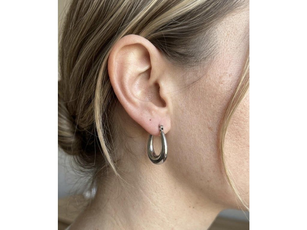 Náušnice sú vyrobené z prvotriednej chirurgickej ocele s vysoko lešteným povrchom v prirodzenom oceľovom tóne. Tento materiál je ideálny pre každodenné nosenie, pretože nereaguje s pokožkou, neoxiduje a zachováva si svoj zrkadlový lesk po dlhé roky. Oválny profil s hrúbkou 5 mm pôsobí luxusne, no vďaka hmotnosti iba 1 g sú náušnice na uchu takmer neciteľné. Integrované kĺbové zapínanie s bezpečnostným zacvaknutím zaručuje bezstarostné nosenie počas celého dňa.