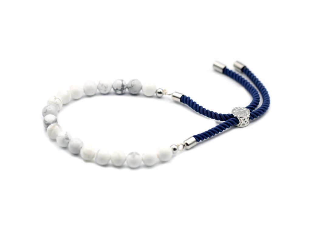 Tento elegantný náramok z bieleho howlitu v kombinácii s postriebrenými prvkami 925 vyžaruje čistotu a hlboký pokoj. Kontrastná tmavomodrá šnúrka dodáva šperku moderný nádych, zatiaľ čo samotný drahokam pôsobí ako balzam na rozbúrenú myseľ. Vďaka nastaviteľnej spone sa náramok prispôsobí každému zápästiu a stane sa vaším osobným symbolom vyrovnanosti.
