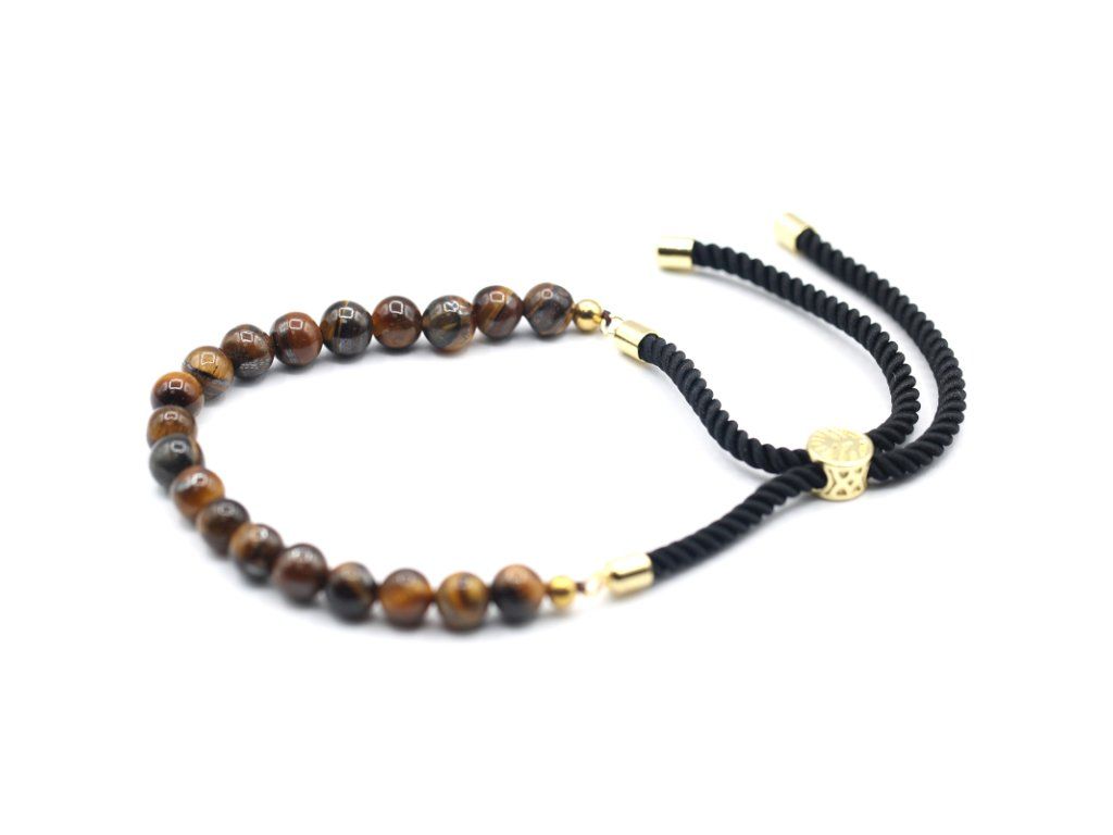 Tento elegantný náramok z tigrieho oka v sebe spája hrejivú energiu zeme s luxusným 18K pozlátením. Čierna pletená šnúrka dodáva šperku nadčasový a sebavedomý charakter, zatiaľ čo drahokam samotný pôsobí ako silný ochranný amulet. Vďaka praktickej nastaviteľnej spone sa náramok dokonale prispôsobí každému zápästiu a stane sa vaším osobným symbolom vnútornej sily.