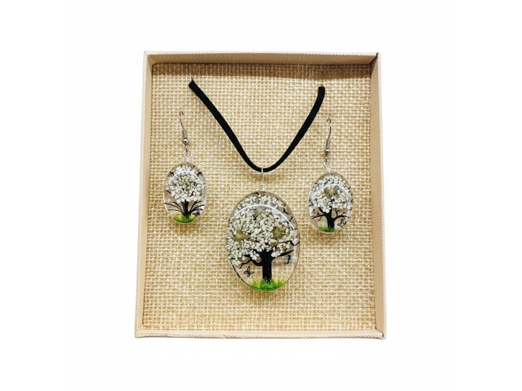 Jemnosť rozkvitnutej prírody zachytená v jedinom okamihu, ktorý môžete nosiť stále so sebou. Táto sada s motívom bieleho stromu vnáša do vášho dňa pocit čistoty a novej energie, pričom každý detail kvetov v priezračnom materiáli pôsobí ako malý kúsok jari. Je to šperk, ktorý nielen zdobí, ale rozpráva príbeh o kráse, ktorá nikdy neuvadne.